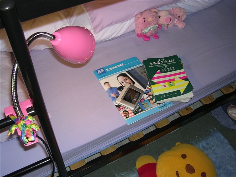 以前在英國寄宿家庭的房間,沒有桌子就坐在地上,把床鋪當桌子念書。